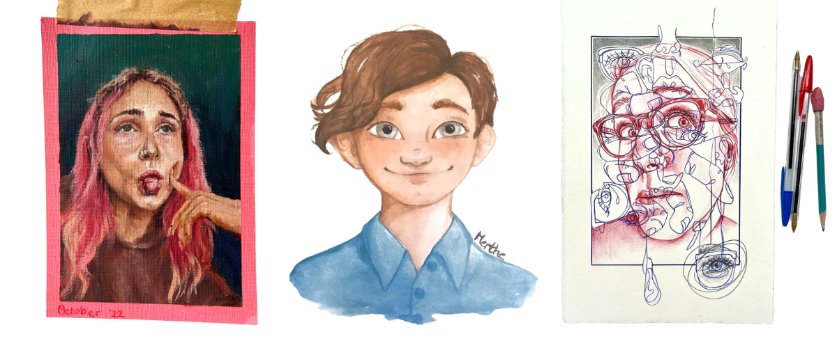 You can use the humble ballpoint pen to DIY a self portrait. Create textured shading with fine strokes and overlay bold designs like the talented artist above! Try playing with monochromatic colour palettes to get familiar with drawing portrait shadows and highlights.